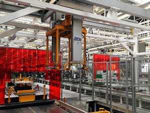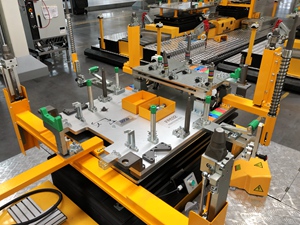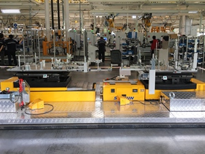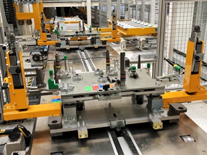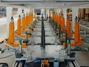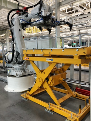 該工廠的生產(chǎn)節(jié)拍為40JPH,主要用以生產(chǎn)S300/S500/S700車型。分托盤采用多車型兼容性設(shè)計(jì),配置有切換機(jī)構(gòu)和插拔銷結(jié)構(gòu),設(shè)計(jì)形式較為復(fù)雜??胀斜P轉(zhuǎn)載首次采用了機(jī)器人+氣動(dòng)抓手+視覺識(shí)別系統(tǒng)的設(shè)計(jì)應(yīng)用,穩(wěn)定可靠。
